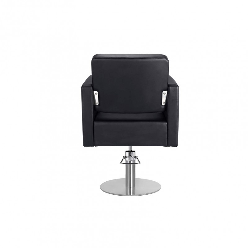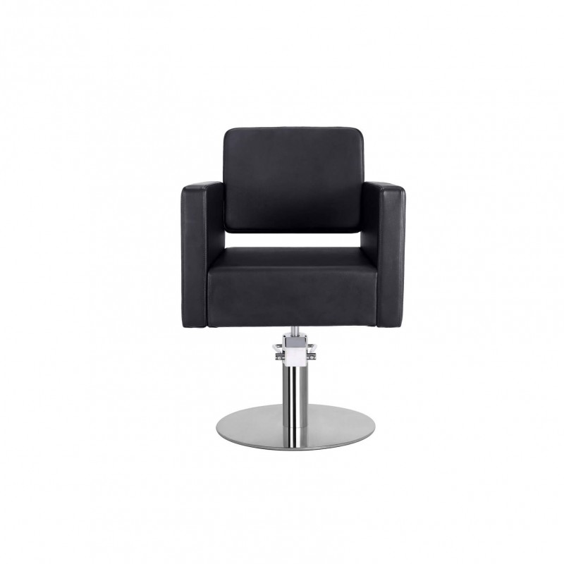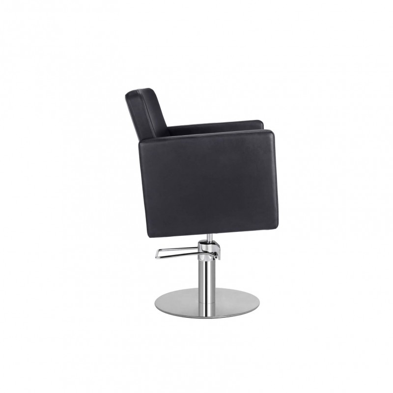 Højkvalitets salonstylingstol. Polstret i PVC-brandhæmmende vinyl. Fremstillet i hurtigt genvindende høj densitetsskum. Træ indre struktur. Låse hydraulisk pumpe. Rund base i rustfrit stål Ø50.