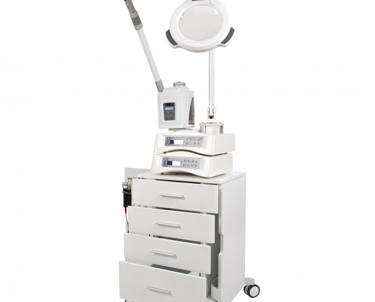 Multifunktionelt tårn standardudstyret med en 5X forstørrelseslampe (1006T), en ozondamper (F-300DT) og en hvidlakeret trævogn med 4 skuffer og 2 sidedøre, der er designet til at opbevare tilbehøret. Vognen tillader montering af 2 skønhedsinstrumenter fra MultiEquipment-serien, op til 12 forskellige funktioner. Firehjulsbasen letter enhedens mobilitet. Beregnet til skønhedssaloner.