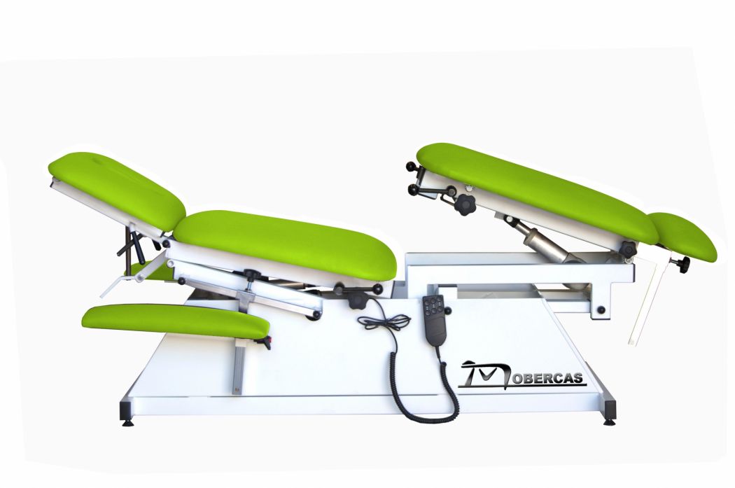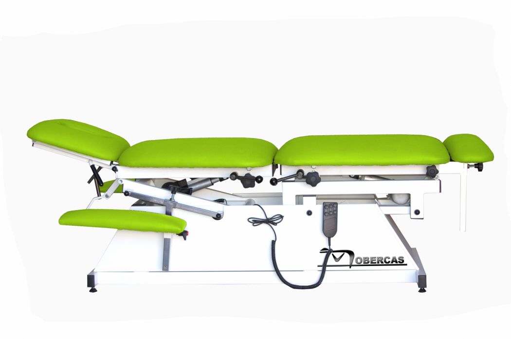 Sähköinen hoitopöytä osteopatiaan ja kiropraktiikkaan, jossa on moottoroitu korkeudensäätö, 21º moottoroitu kallistus, 22º moottoroitu keskitaite, 22º moottoroitu lonkankorotus, kaksoismoniasentoiset niskatuet zed-asennolla ja hengitysaukolla, ulosvedettävät ja korkeussäädettävät käsinojat.
