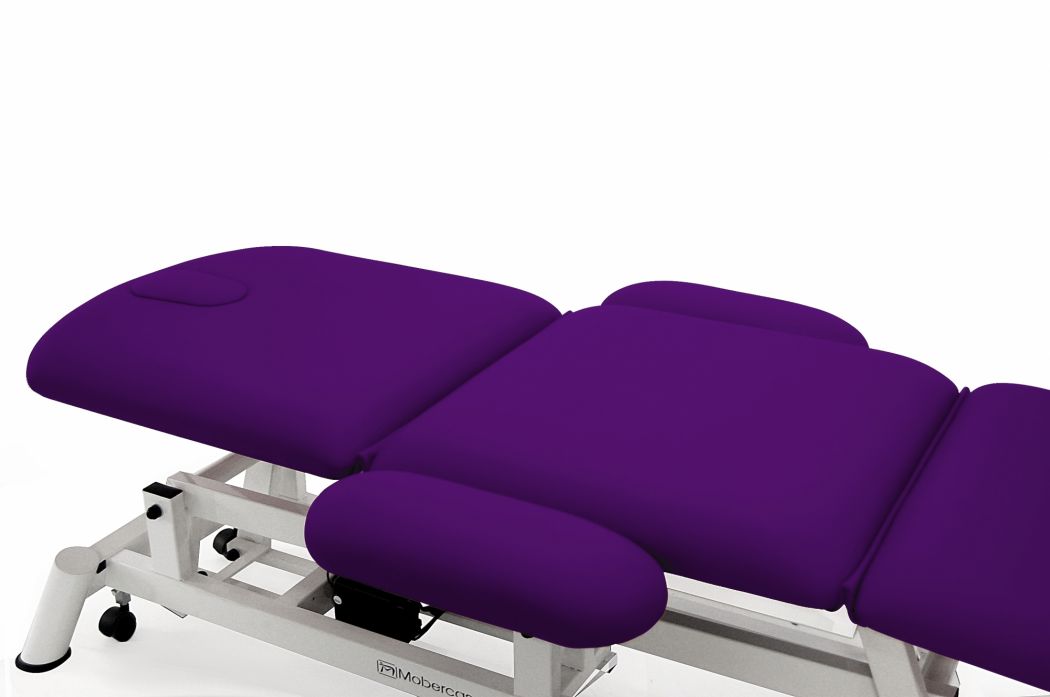 Sähköinen hoitopöytä, jossa on 3 osaa, pehmustetut tasaiset käsinojat, hengitysaukon tulppa ja sisäänvedettävät pyörät.