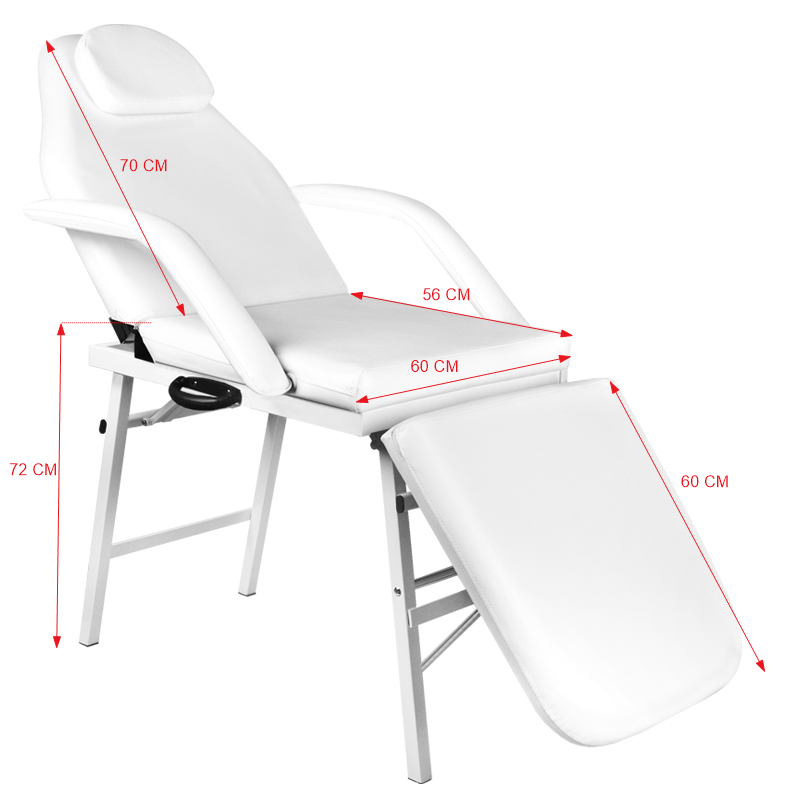 En stabil och hopfällbar stol avsedd för fotvård. Både arm- och huvudstöd är löstagbara. Stolen är tillverkad i eko läder av hög kvalitet som är lätt att rengöra och tåligt för desinfektionsmedel. Rygg- och fotstödet ställs in manuellt. Lätt att ställa undan då den tar mycket liten plats ihopfälld.Storlek:uppfälld:höjd 74 cmlängd 185 cmbred 60 cminklusive armstöd 80 cmihopfälldlängd ca. 88 cmbred 60 cmdjup 40 cm