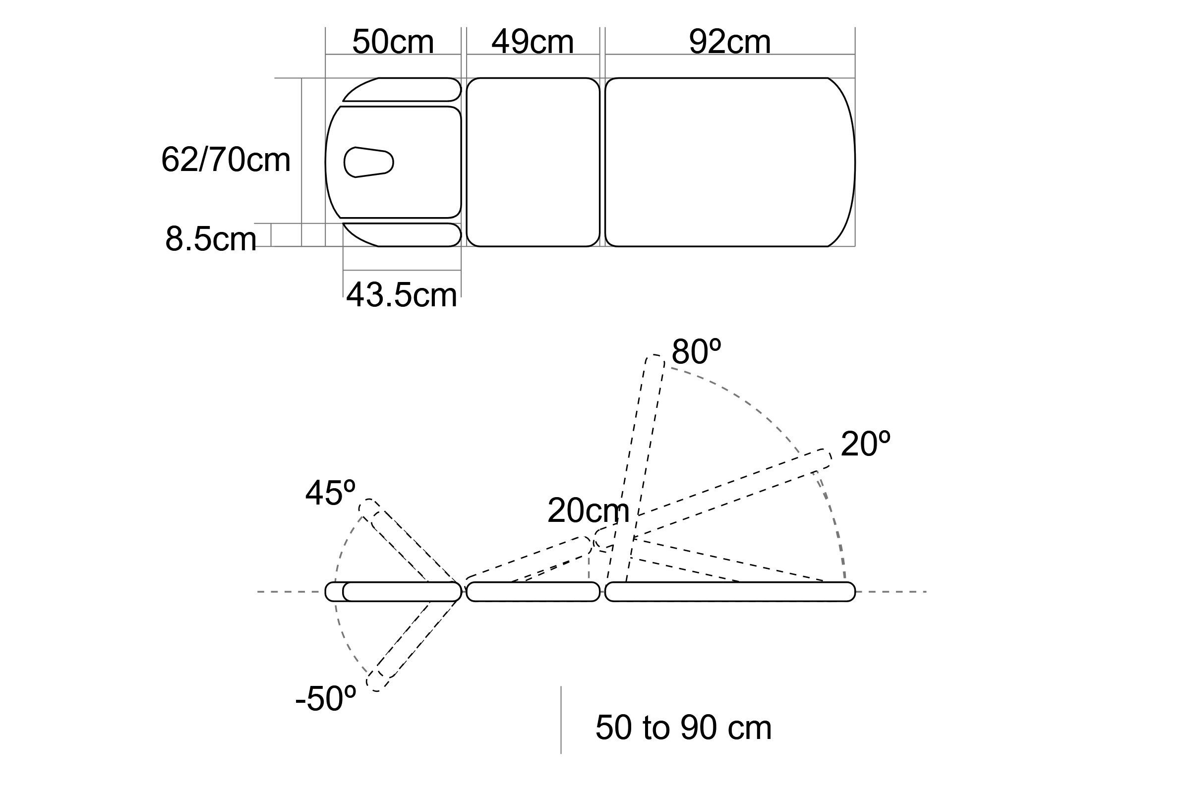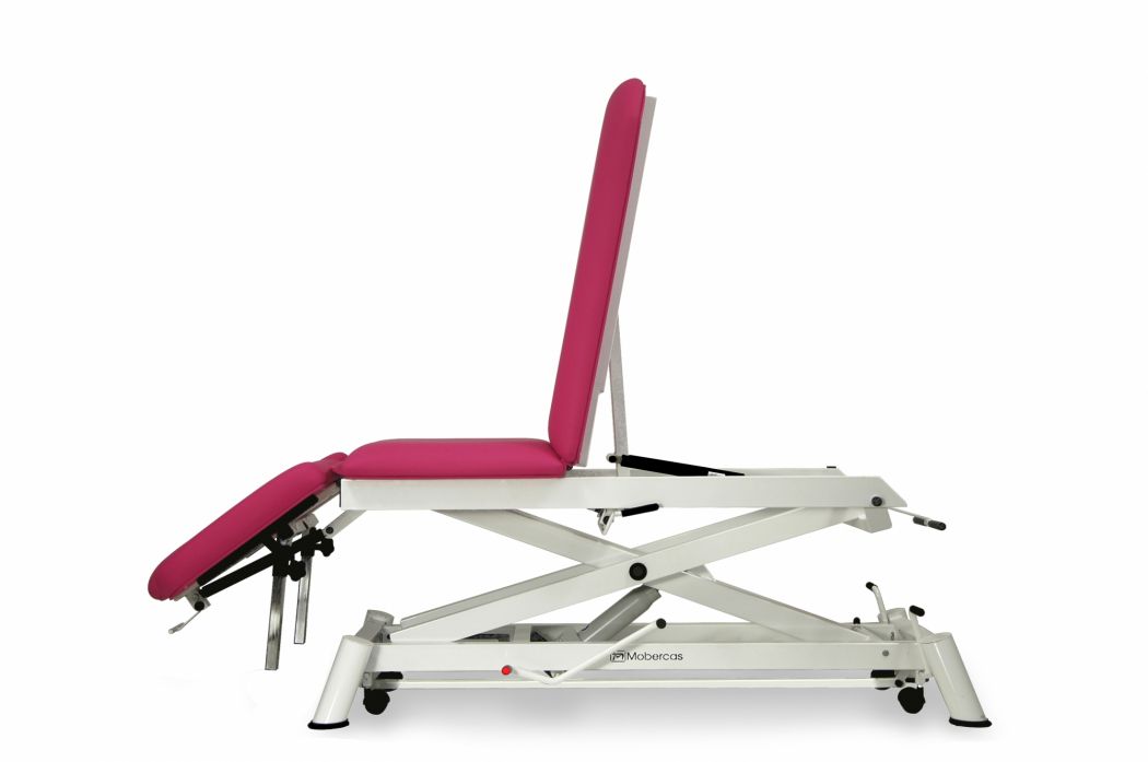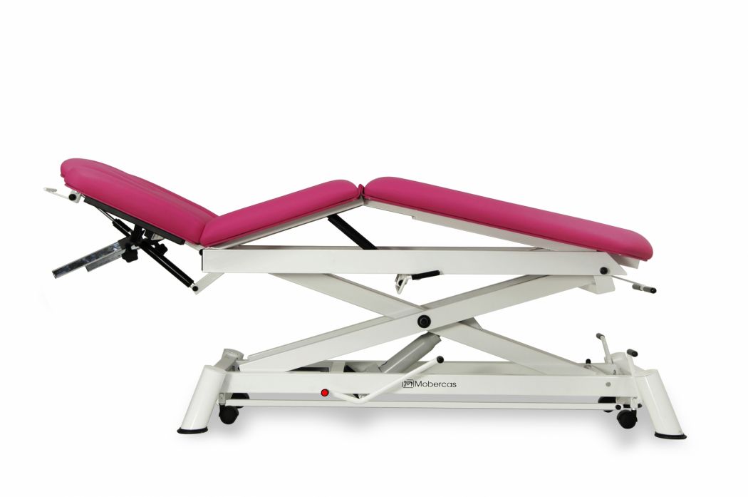 Hydraulinen osteopatiapöytä, jossa on 5 osaa ja negatiivinen selkänojan säätö, keskimmäinen taitto ja pystysuuntainen nosto ilman vaakasuoraa liikettä. Sisältää selkänojan viereen sijoitetut käsinojat, joita voidaan säätää korkeuden ja leveyden mukaan, hengitysaukon tulpan ja sisäänvedettävät pyörät. Trendelenburg-asento kahden kaasujousen avulla.