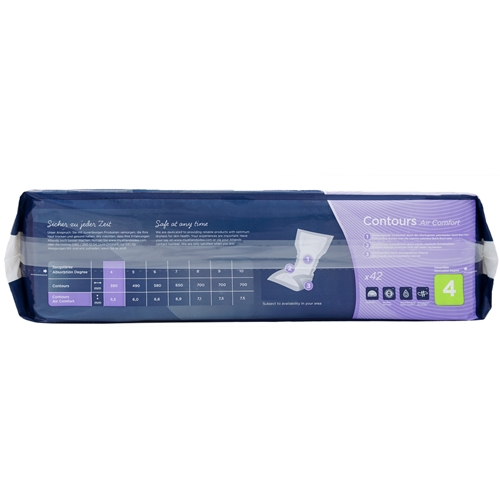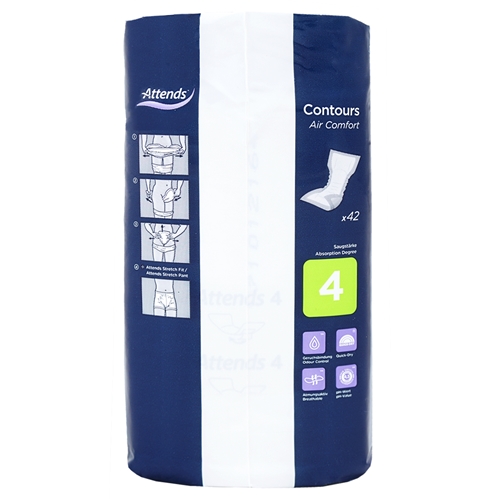 Attends Contours on kehonmuotoinen suoja, joka on tarkoitettu käytettäväksi henkilöille, joilla on keskikokoisia tai suuria virtsa- ja/tai ulostevuotoja. Pintakerros on pehmeää kuitukangasta. Quick-Dry-levityskerros pintakerroksen ja massaytimen välissä lisää kuivuuden tunnetta. Odour Protection; superabsorbentit sitovat enemmän ammoniakkia, mikä vähentää pahan hajun riskiä. Matala pH-arvo (4,5). Ilmanläpäisevä este kerros, jossa on tekstiilimäinen tausta, pitää nesteen ja antaa ihon hengittää. Muotoillaan pitkittäisten joustonauhojen avulla ja kiinnitetään teipillä suojan alapuolelle alushousuihin/kiinnityshousuihin. Sisältää kosteusindikaattorin ja kokomerkinnän. Käytännöllinen abs 241 ml.