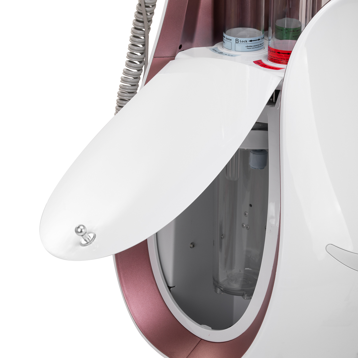 Väterenande innebär verkan av aktiva vätemolekyler. På grund av sin lilla storlek tränger väte in i de djupa lagren av epidermis, där det neutraliserar fria radikaler som är ansvariga för hudens åldringsprocesser. Denna behandling rengör inte bara, utan när och återfuktar också huden, vilket återställer dess hälsosamma lyster. Apparaten använder innovativ konstant väteproduktionsteknik, vilket möjliggör omedelbar start av behandlingen. I icke-vätebehandlat läge kan behandlingen utföras med vatten. Vattenbaserad rengöring är en metod som använder en vattenström kombinerad med en sugfunktion, vilket möjliggör precis och hygienisk borttagning av döda hudceller och föroreningar. Det är en skonsam men effektiv form av peeling, särskilt rekommenderad för känslig hud.