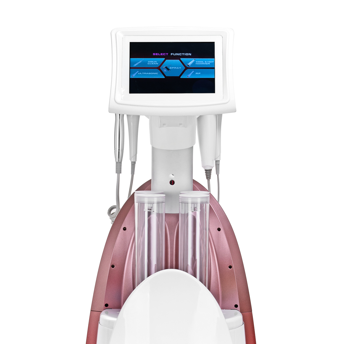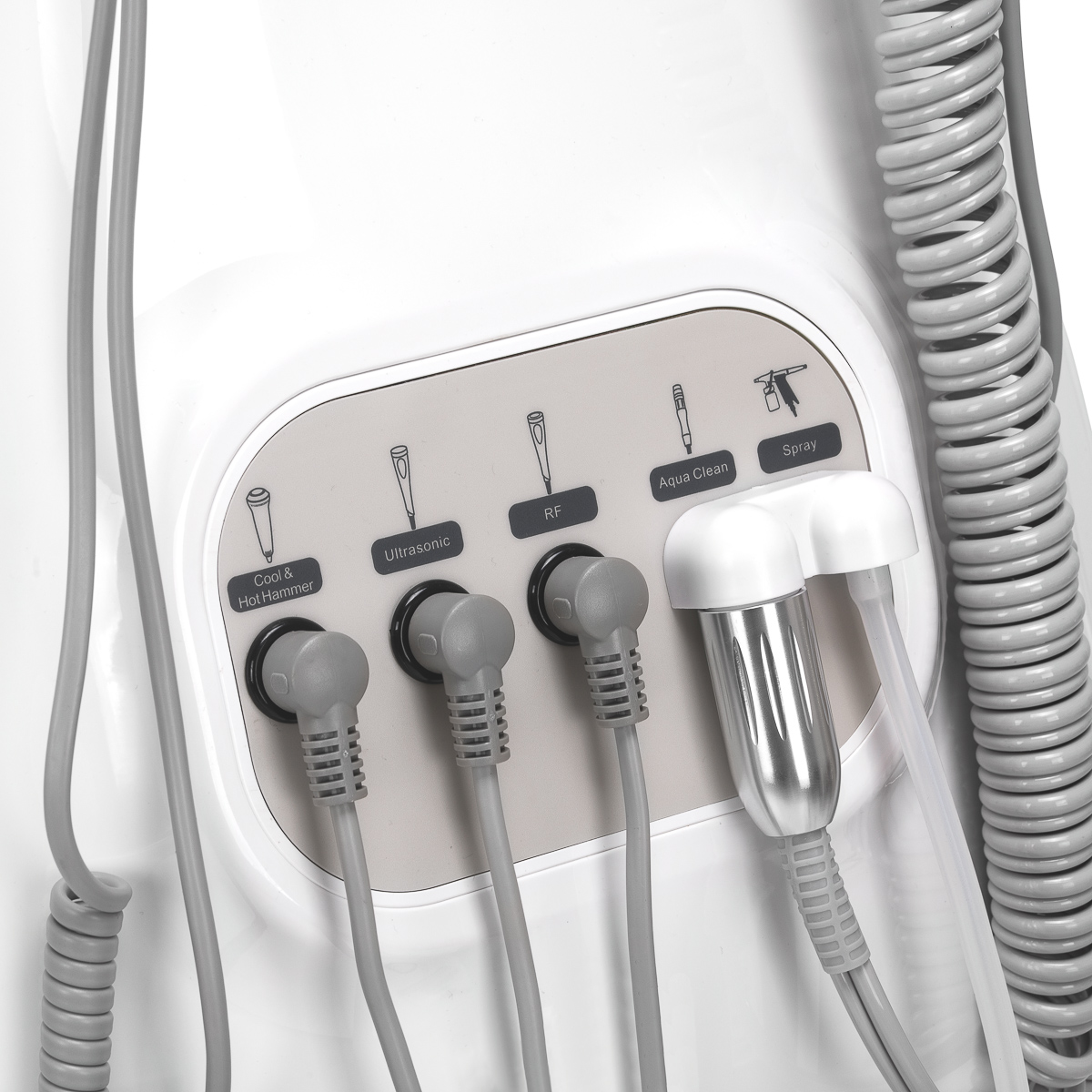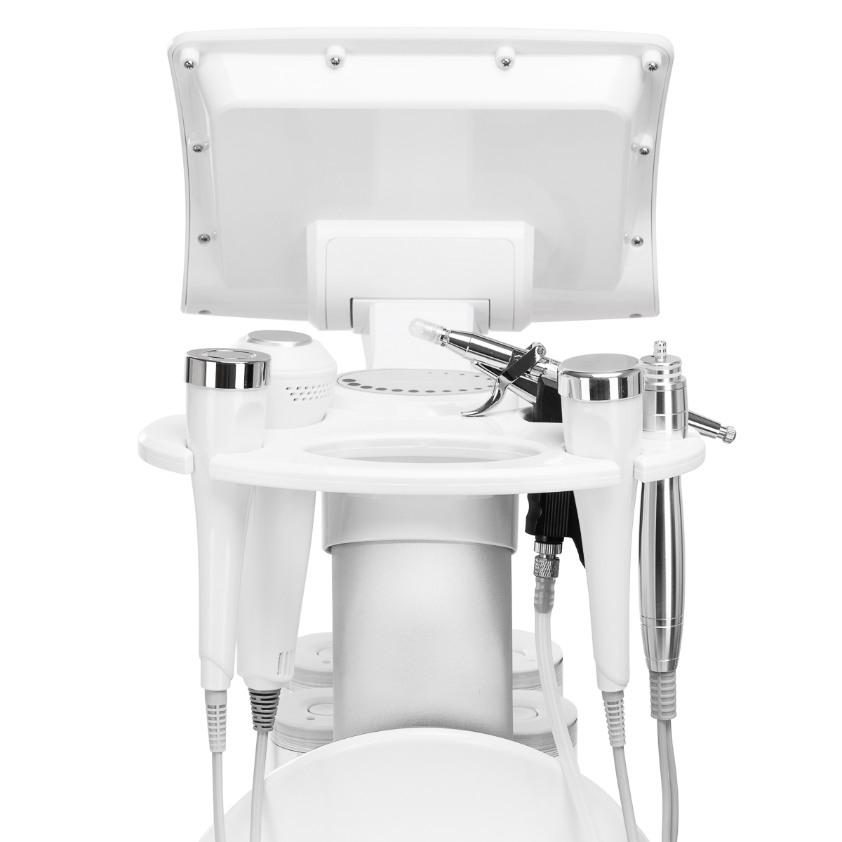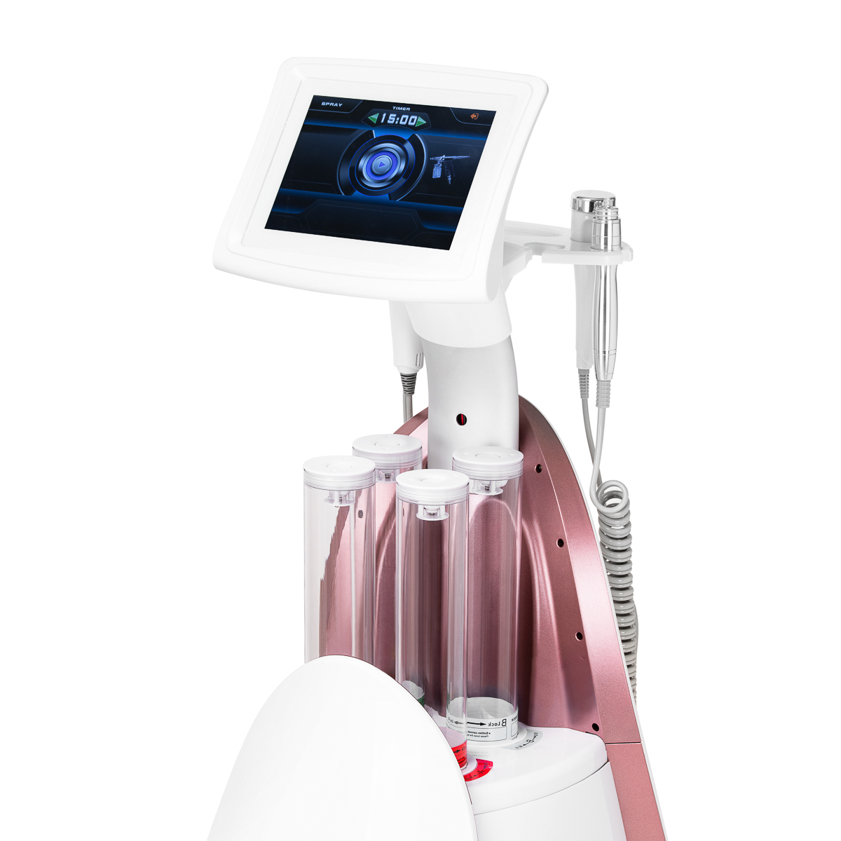 Flaskorna som ingår i setet möjliggör förberedelse av olika formuleringar, anpassade till hudens individuella behov, vilket ökar möjligheterna att anpassa behandlingar. Elektronisk reglering av vätskeflöde möjliggör val av en av fyra lösningsflaskor som kan kombineras fritt, vilket ger stor flexibilitet i användningen. Det automatiska diagnossystemet övervakar apparatens drift i realtid. Vid funktionsfel utlöser det ett larm och stoppar automatiskt arbetet. De fjäderbelastade handtagskablarna, tillverkade av högkvalitativa material, kännetecknas av hög motståndskraft, vilket säkerställer deras hållbarhet och flexibilitet.